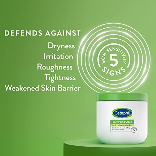 Details: Care for your dry to very dry skin with CETAPHIL Moisturizing Cream, a non-greasy, moisture rich cream for the whole body. Enriched with sweet almond oil and vitamin E, it immediately comforts and instantly hydrates dry, sensitive skin. Formulated with a new blend of key ingredients: hydrating glycerin, panthenol (vitamin B5) to hydrate, soothe and preserve the skin barrier, and niacinamide (vitamin B3) to help smooth skin texture and retain skin moisture barrier. For long lasting hydration, this extra strength moisturizer binds water to the skin to deeply replenish the skins moisture and prevent moisture loss, hydrating and soothing skins dryness for 48 hours and completely restoring the skins moisture barrier in one week. Ideal for very dry areas of skin on the hands, feet, elbows and knees, leaving your skin feeling soft, smooth and nourished. This fragrance free, paraben free, and sulfate free formula will not clog pores and is clinically tested for even the most gentle skin. Effectively defends against 5 signs of skin sensitivity.
