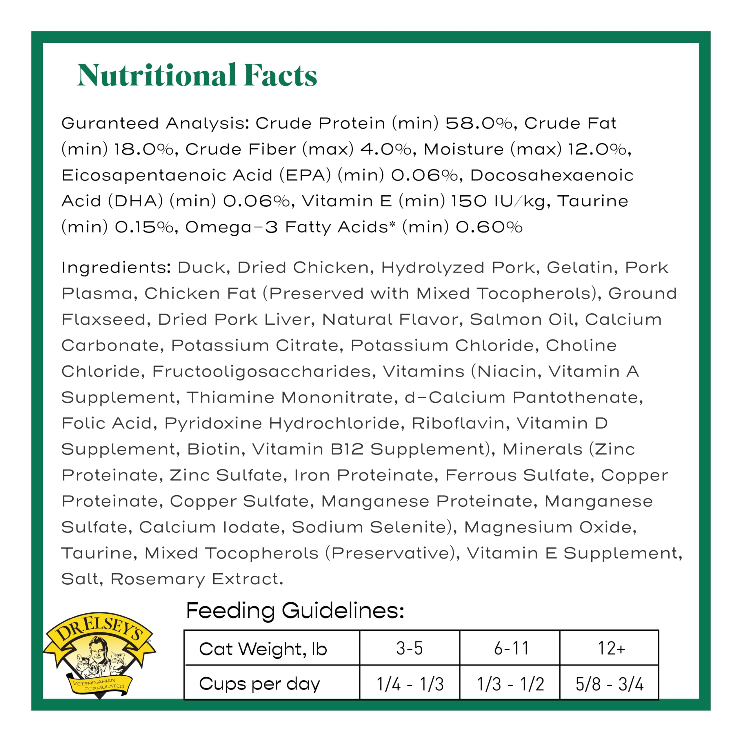 Details: 90+% of protein is animal based. High protein optimizes body condition for all cats. Primary ingredients are among the highest biological value proteins available. 100% Grain free and gluten free Omega 3 fatty acids. No fillers.