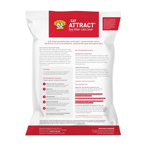 Details: Dr. Elsey’s Cat Attract Litter is the problem cat training litter! This scoopable litter provides a solution for cat owners whose cats do not use their litter box. Blended with a natural herb attractant, Cat Attract’s herbal scent, ideal texture and particle size combine to solve litter box problems. Non-use of the litter box is the number one reason a cat is abused or finds itself in a shelter. Cat Attract is the first cat litter to specifically address problem cats. Each box has a free Litter Box Solutions Booklet to help cat owners solve their litter box problems.
