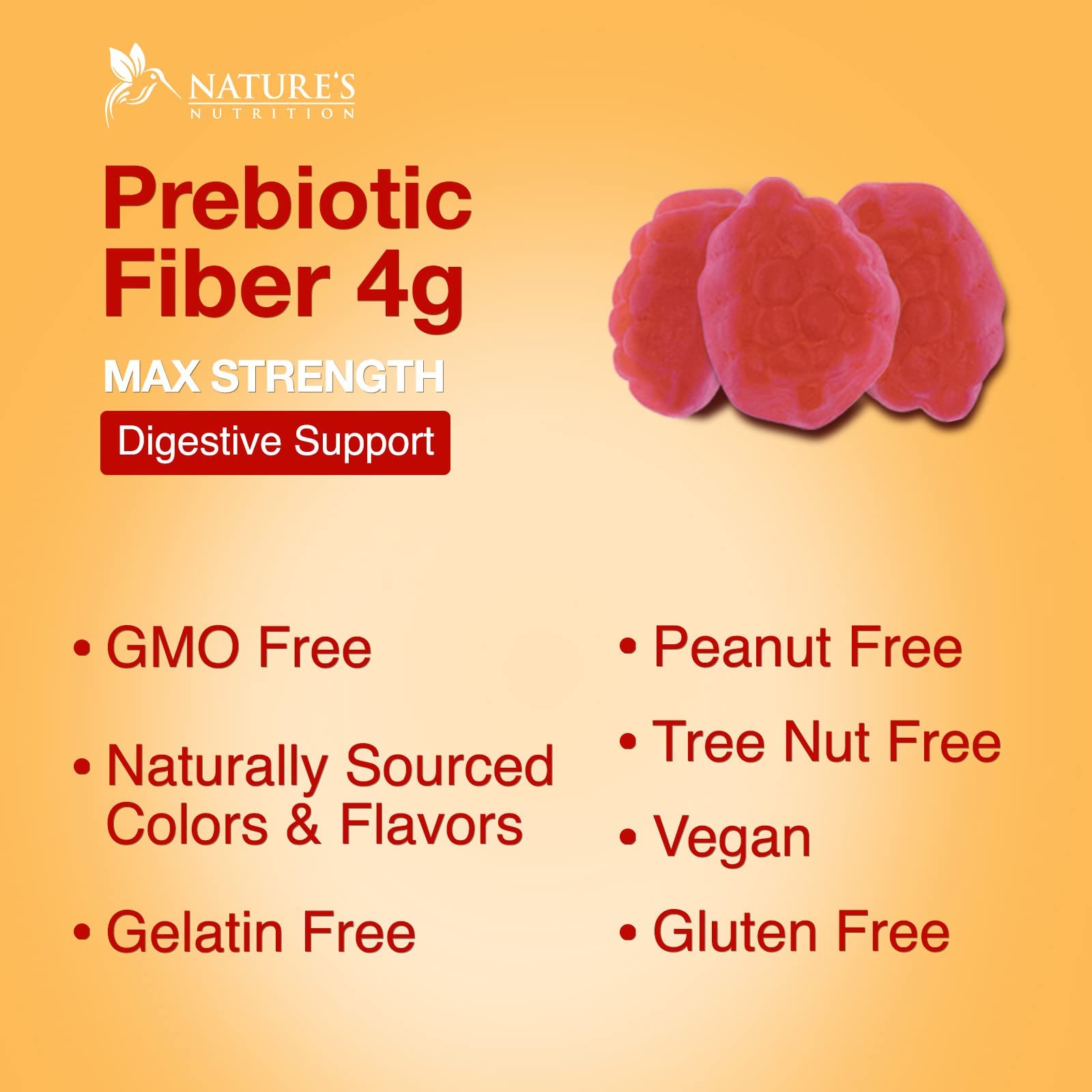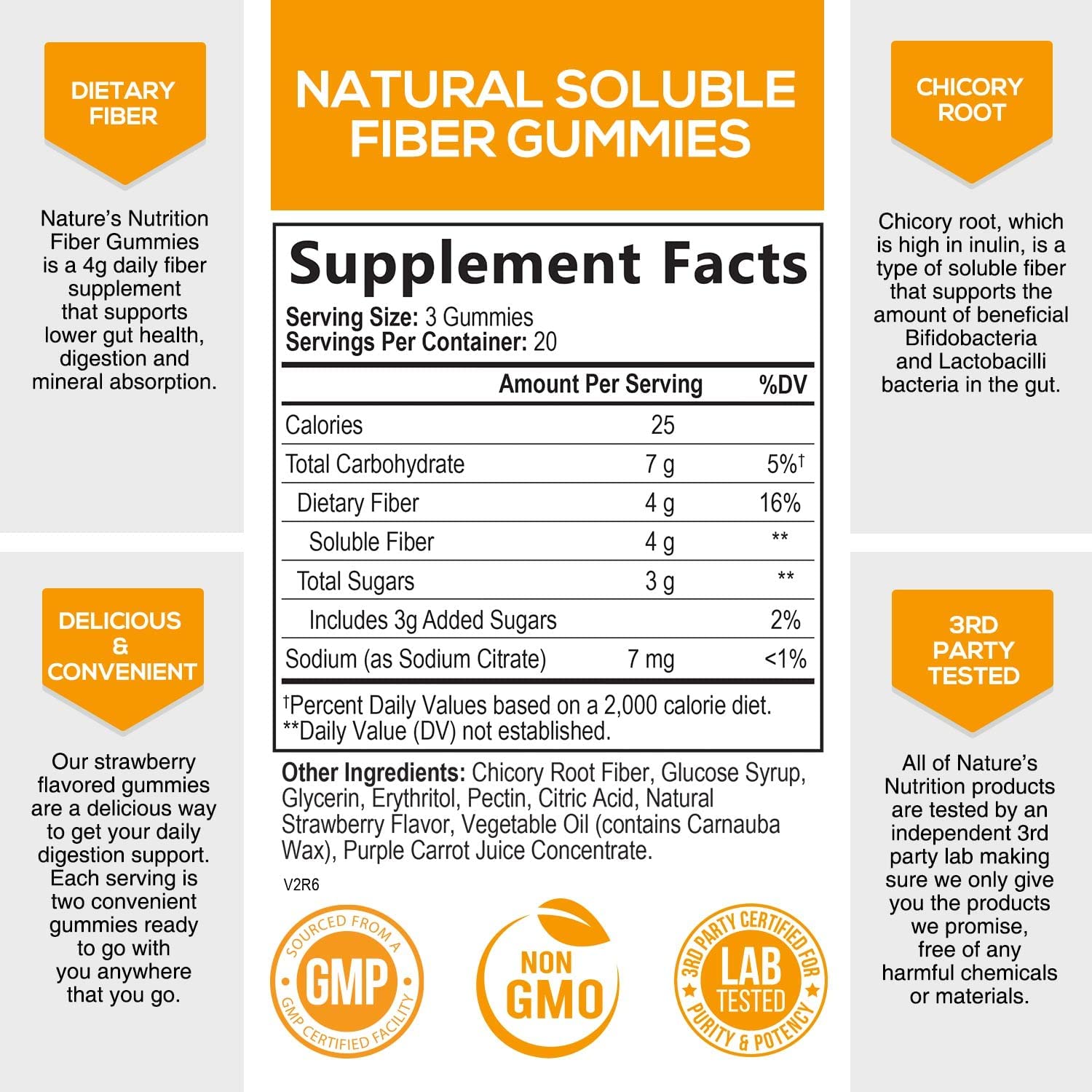 Details: Nature’s Nutrition Fiber Gummies for Adults and Kids are the perfect way to add fiber into your daily life.Unlike many powders, capsules, or vitamins, Nature’s Nutrition Fiber Gummies are plant-based, yummy and enjoyable. Made with 300mg of inulin fiber per 2 gummies, perfect for women, men, and children. Inulin is a soluble plant fiber that’s present in high amounts in the chicory root. Inulin takes up a lot of room during digestion. Once eaten it absorbs water, helps to form stool, and allows you to go to the bathroom more easily. You will love his gentle digestion support.Supplement Facts (Per 2 Gummies): Inulin (Chicory Root) – 300mg Other Ingredients: Glucose Syrup, Maltitol, Glucose, Modified Starch, Pectin, Natural Strawberry Flavor, Vegetable Oil, Purple Carrot Juice ConcentrateEach bottle of fiber gummy dietary supplements is proudly manufactured and bottled following strict cGMP guidelines. Our Fiber Gummies are third-party certified for purity and quality by an experienced dietary supplement laboratory.