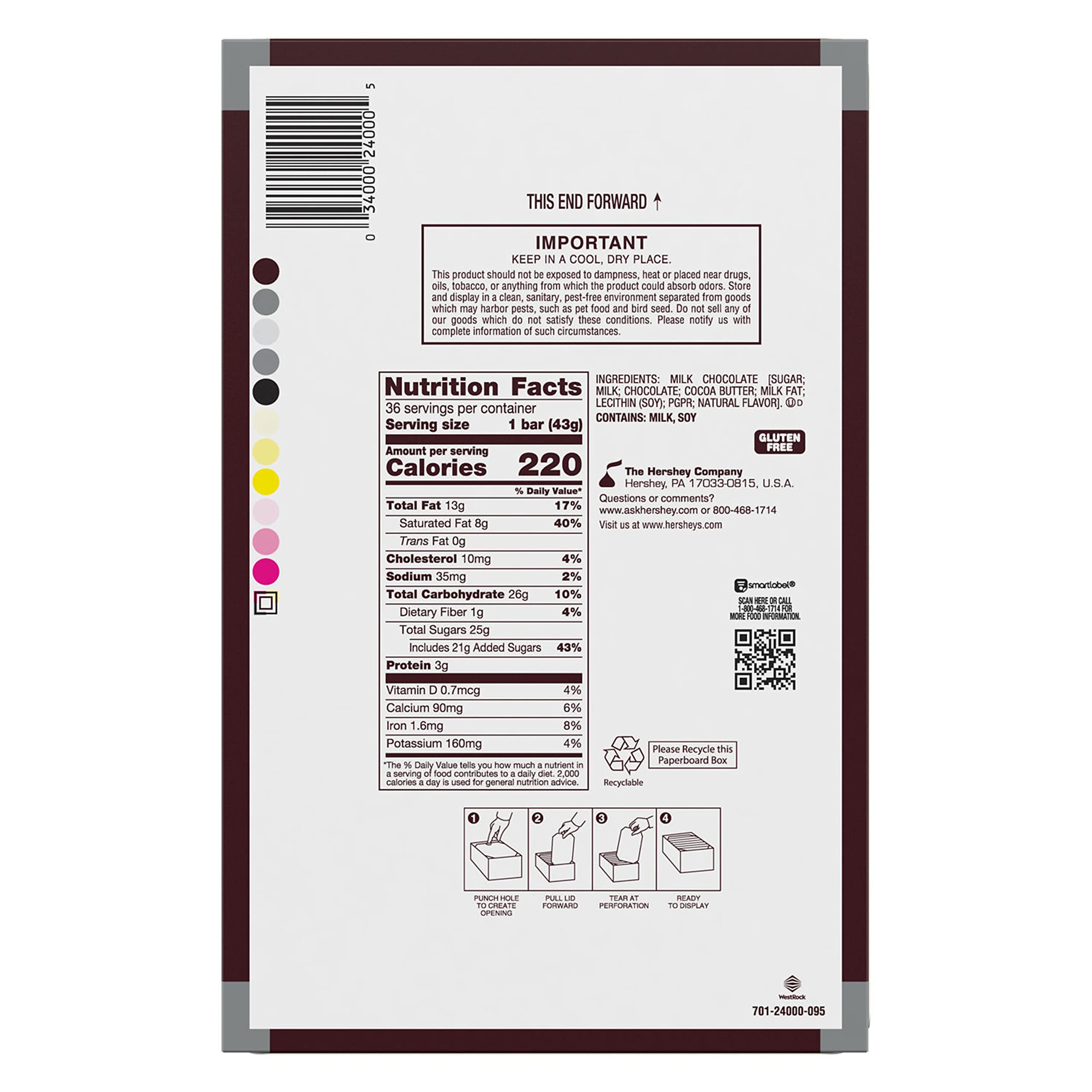 - Contains thirty-six (36) 1.55-ounce HERSHEY’S Milk Chocolate Candy Bars in a bulk box