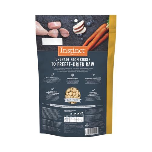 Details: Instinct freeze dried raw meals grain free recipe dog food is a healthy dog food that provides a superior alternative to traditional kibble. Featuring 3x more real meat and nutrient-rich organs, this raw dog food is perfect for a significantly healthier meal. Each bite boasts more animal-based protein, ensuring your dog receives the best nutrition available, translating to happier and more exciting meal times. Unlike traditional dog foods, our raw recipes are never cooked. This preservation method maintains the full integrity and nutrients of the ingredients, resulting in 100% complete and balanced meals for your furry friend. Freeze-dried to retain essential nutrients, our minimally processed pet food supports optimal digestion and nutrient absorption, offering benefits that cooked kibble just can’t match. Feeding your dog raw food can promote healthier digestion, lean muscles, strong bones, and vibrant skin and coat. This healthy dog food is made without grains, making it an excellent dog food grain free option. Additionally, it contains no corn, wheat, soy, legumes, artificial colors, or preservatives, ensuring only the purest nutrition reaches your pet’s bowl. Harness the power of raw ingredients with Instinct’s minimally processed dog food, made from real meat and whole food ingredients. Our products are protein-packed and madein the USA with the finest ingredients from around the world.