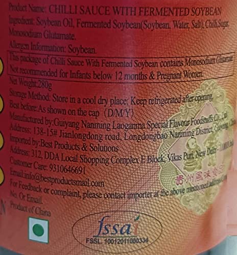 • Ingredients: Soybean, Chilli, Canola Oil, Salt, Sugar, Monosodium Glutamate, Sulfur Dixide, Sodium Sulfate.