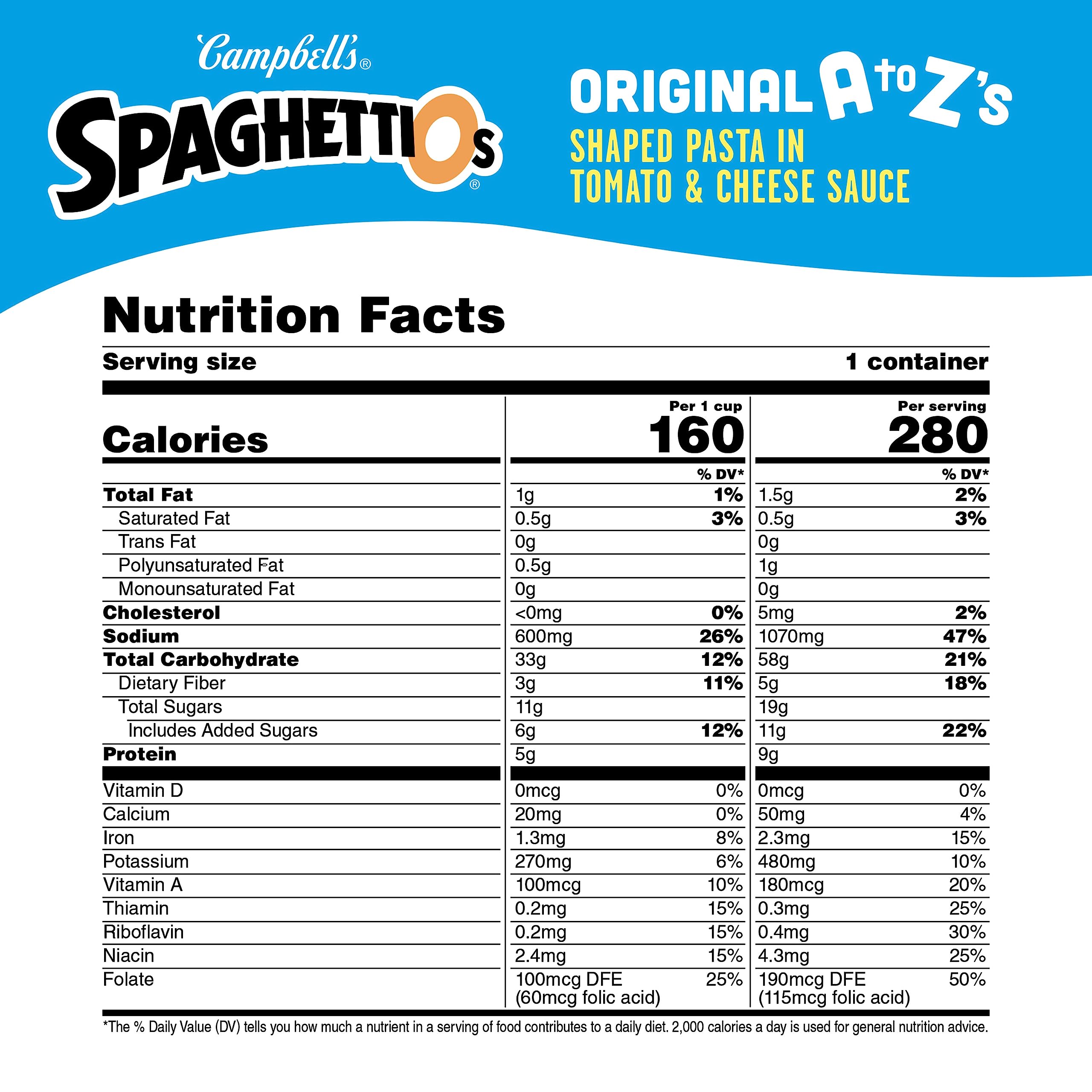 Details: Dig into a dish the whole family will enjoy with SpaghettiOs Original A to Z’s Canned Pasta. Each delicious bite of this canned pasta features alphabet pasta shapes to add some fun to any snack. This canned pasta puts a yummy spin on traditional tomato sauce with a tomato and cheese combo that makes a great addition to any meal. One cup of SpaghettiOs Canned Pasta contains 1/2 cup of vegetables, as well as 4 essential nutrients for a healthy snack or lunch you can feel good about. Break out this convenient canned food when you’re craving tasty snacks, or prepare it as an entree for a fun kids lunch. This microwave pasta is ready in as little as 3 minutes. Just heat in a microwave-safe bowl on high for 1 1/2 to 2 minutes, let stand for 1 minute, then stir. Or, cook up this fun-loving pasta on the stove. The can is recyclable for easy disposal. Add character to every bite with SpaghettiOs: the neat round spaghetti you can eat with a spoon. In addition to A to Z Shapes, SpaghettiOs offers a variety of unique pasta in fun shapes and sizes, including Spider-Man, Disney Princesses, Star Wars and more!