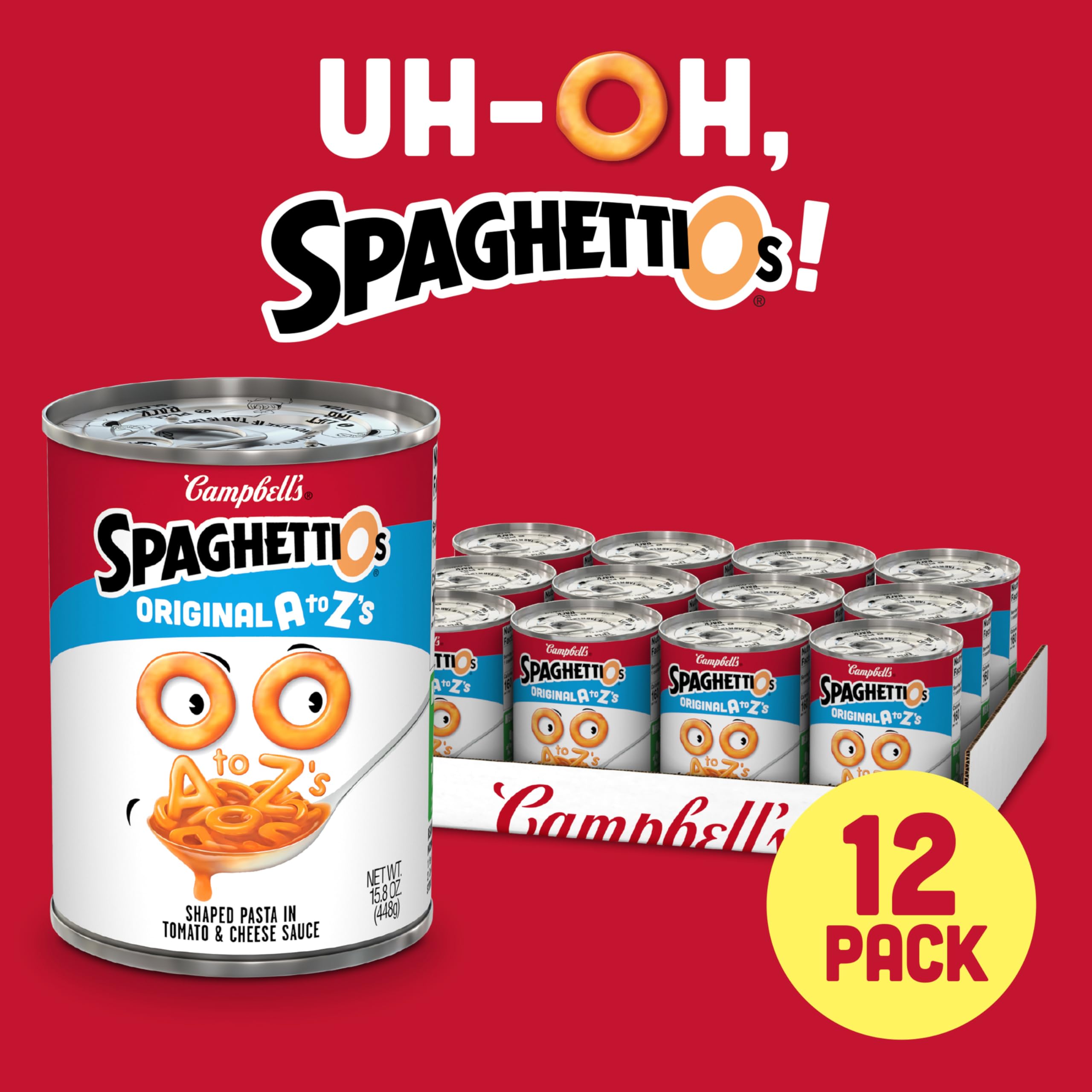 - Twelve (12) 15.8 oz can of SpaghettiOs Original A to Z’s Canned Pasta